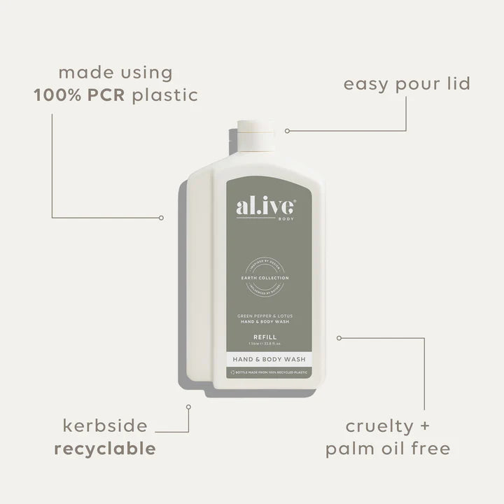 Each refill is designed to refill the 500ml al.ive body Hand & Body Wash bottle twice. With a controlled-flow spout for mess-free pouring, compact shape for easy storage, and full kerbside recyclability, it offers a practical, premium solution while extending the life of the product you already love.