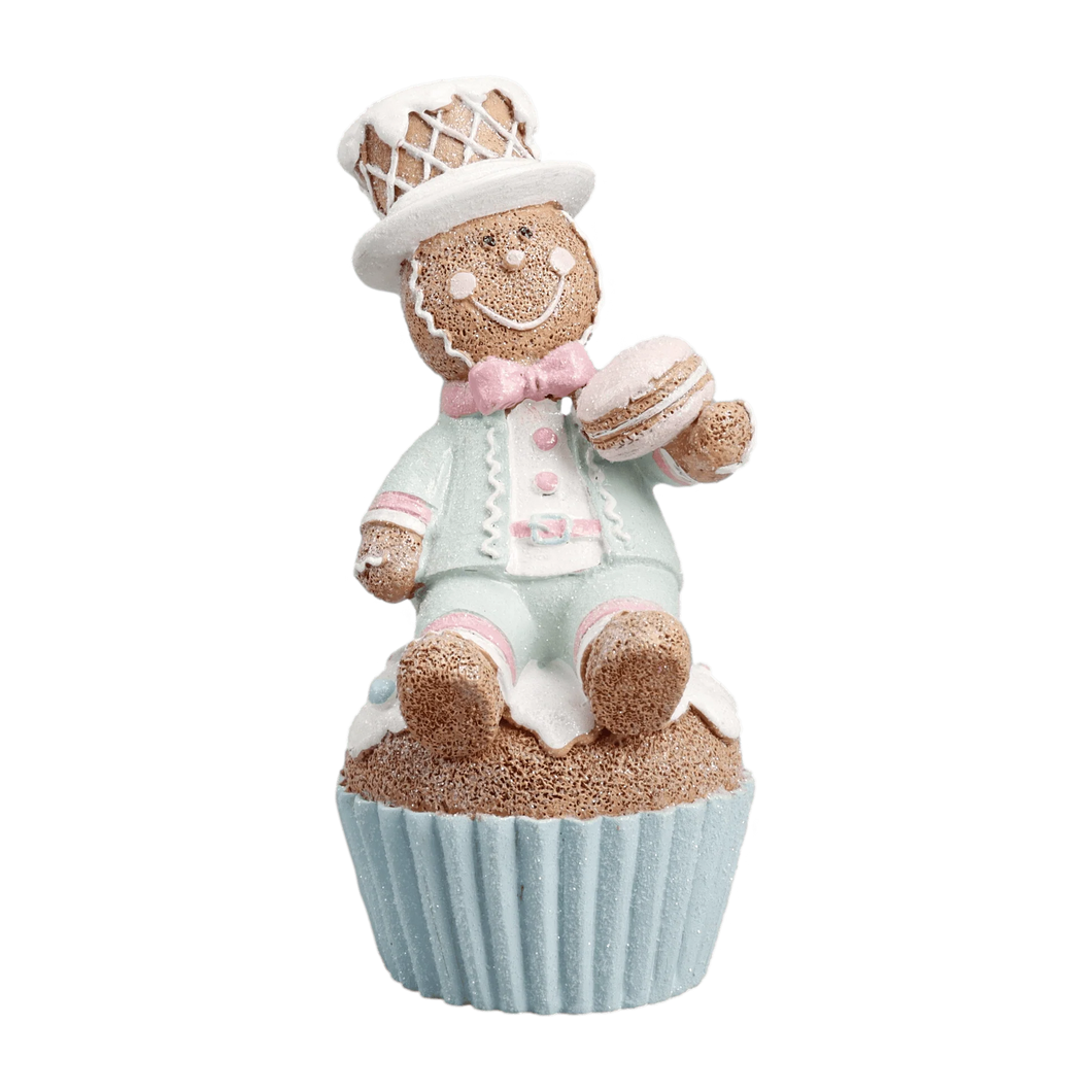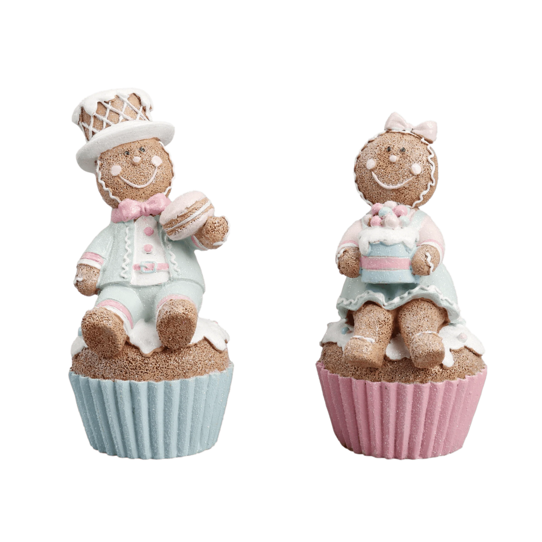 Sitting Gingerbread boy on blue cupcake.Made of Resin.Matching Gingerbread girl on pink cupcake