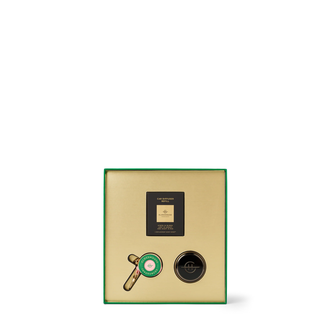 Includes: 1 x Black Refillable Car Diffuser, 3 x Scent Disk™ Refills (Kyoto In Bloom, Lost In Amalfi & One Night In Rio), 1 x Keyring designed to hold your smart tag, all packaged in a Gift Box with illustrations by Aeoniumsky.