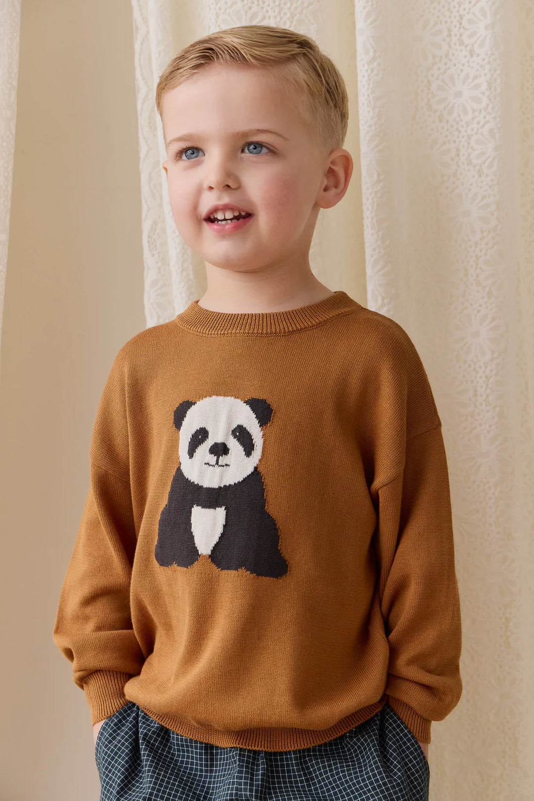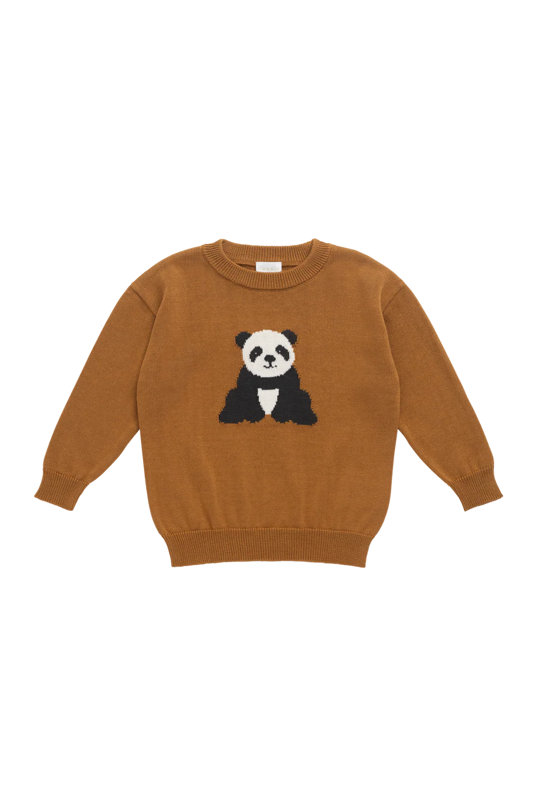 The Panda Knit Jumper – Suede is a cozy and charming knit your little one will love. Crafted from 100% cotton in a warm suede tone, this jumper features an adorable panda motif that adds a sweet and playful touch to its classic silhouette.