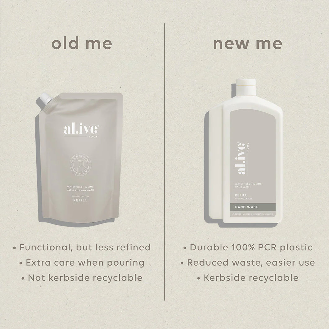 Each refill is designed to refill the 300ml al.ive body Hand Wash bottle over three times. With a controlled-flow spout for mess-free pouring, compact shape for easy storage, and full kerbside recyclability, it offers a practical, premium solution while extending the life of the product you already love.